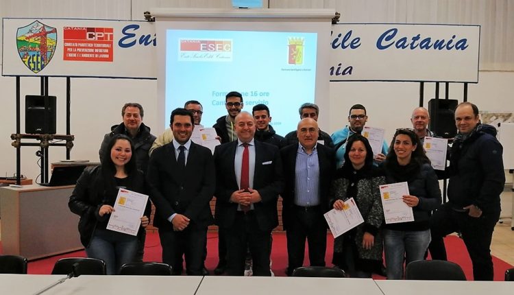 A conclusione del corso obbligatorio di 16 ore, il presidente e il direttore dell’Ente Scuola Edile, Giuseppe Alì e Giacomo Giuliano, alla presenza del sindaco di S. Agata Li Battiati Marco Nunzio Rubino, hanno consegnato ai dieci partecipanti l’attestato di frequenza, necessaria prima di poter esercitare il lavoro all’interno dei due cantieri.