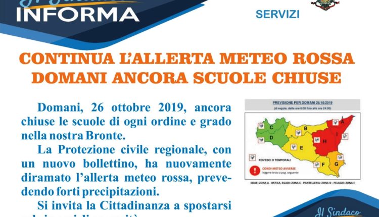 Continua intanto l’allerta meteo rossa e anche oggi le scuole a Bronte sono rimaste chiuse.