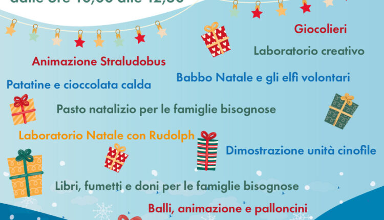 Tante le attività previste: laboratorio creativo per la realizzazione piccoli lavoretti di natale, realizzazione di palloncini, donazione di libri e fumetti, dimostrazione di unità cinofile, distribuzione di doni e dolciumi per le famiglie bisognose. Tante le attività di animazione e giocoleria, presente anche un banchetto per la preparazione di patatine e cioccolata calda. Presso la parrocchia San Giovanni Apostolo e in una postazione nei pressi dell’ingresso della Villa Bellini è prevista anche la distribuzione di doni e pasti caldi alle famiglie bisognose.